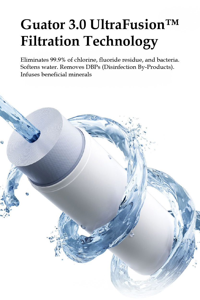 Guator’s 6-stage filtration softens and restores water, removing chlorine, fluoride, DBPs, and bacteria while adding beneficial minerals and negative ions—creating a gentle, spa-like experience at home.